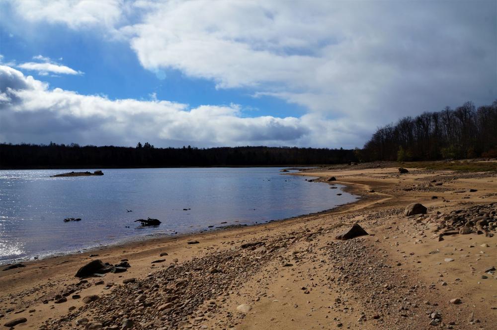 There are some simple, yet very handy, maps of the trails available at the trailhead. The main trail from the parking area begins at a dirt road that leads east towards the mountain. The trails are marked by colors (red and blue), and there are several routes you can take. We first headed to the mountain following the red trail markers. Around a half a mile in, you will come to a T, with the trail to the mountain ahead (east), the reservoir to the right (south). The trail starts to climb from here, and soon gets steeper. Just short of a mile, ahead and above you will see an old steel-clad building. This was part of the radio relay system. There is still some old equipment in the building, and scattered around outside. The trail from here is a bit steeper, and not as well marked – but still not too hard to find. You will soon find yourself on the summit, and the ruins of the fire tower are ahead to the right. Past that near an overlook, there are the footers to the cabin. All that is left is the cement footers. The summit has grown over with trees since the fire tower days, but there is a nice open view of Stark reservoir to the north. If you walk East along the summit during fall/winter, you can see glimpses of the reservoir and Bog mountain through the trees. Back at the intersection of the red & blue trails, you can head left (south) to the reservoir. From the reservoir, you can head west along the shore and rejoin the trail at the dyke and end up back at the main trail/woods road that you came in on. If you went straight to the summit and backtracked, you would hike about 2.2 miles round trip, if going back along the reservoir – 3.6 miles. This is a great trip and would be a wonderful trek on snowshoes as well.