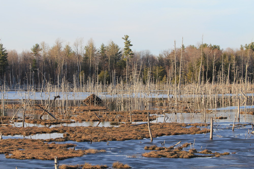 Beginning at the main entrance next to the water tower, the multipurpose trail quickly forks. Bearing right, the trail continues on the loop with a short side trail on the right leading to an observation deck with views of a swamp, home to a beaver hut and an osprey nest. Continuing on the trail, there is a short trail to the left which can be made into a one-mile loop, or continue on the full loop for a 1.7-mile trip.