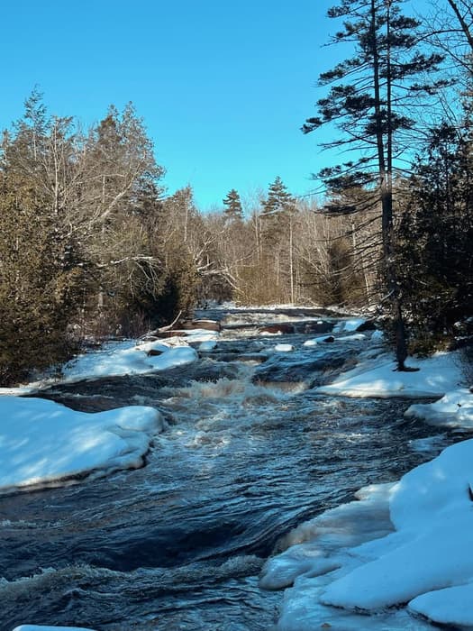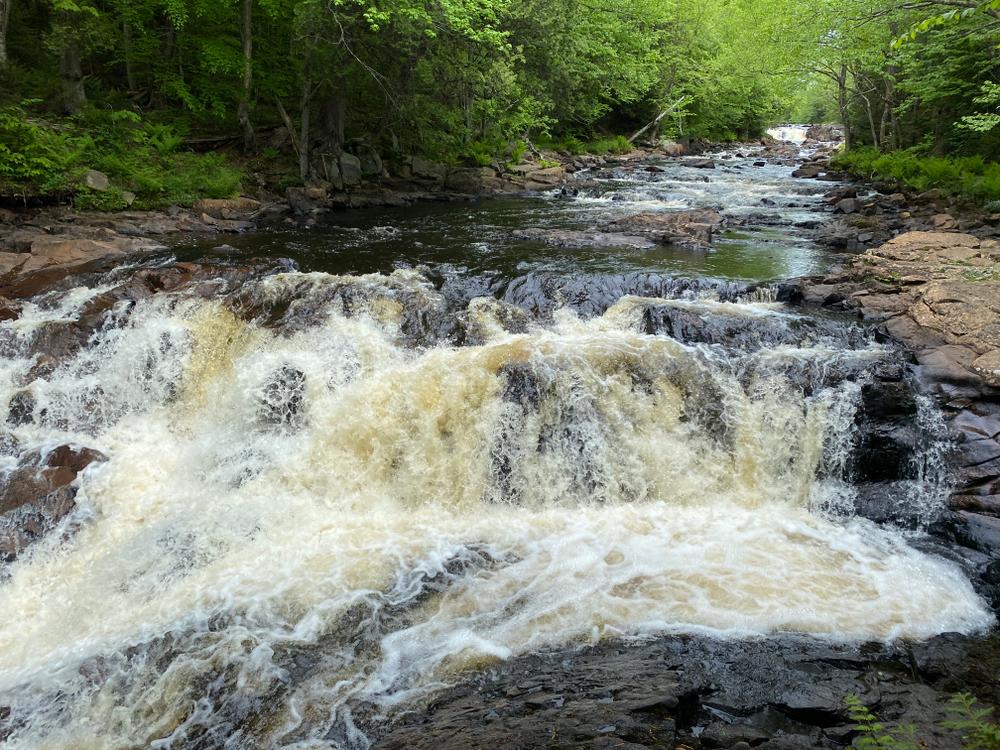 The Copper Rock Falls Trail travels just over 0.5 miles along the bank of the Grass River, passing Copper Rock Falls and then an additional two unnamed falls before reaching the flatwater pool above the falls.