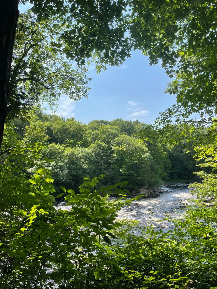 You will hear the falls before you see them. The trail turns to your right (west) at about .25 miles and enters into the woods. The first views of the falls can be seen here. There is a nice shaded picnic area overlooking the falls. The mill site is downstream from the falls.