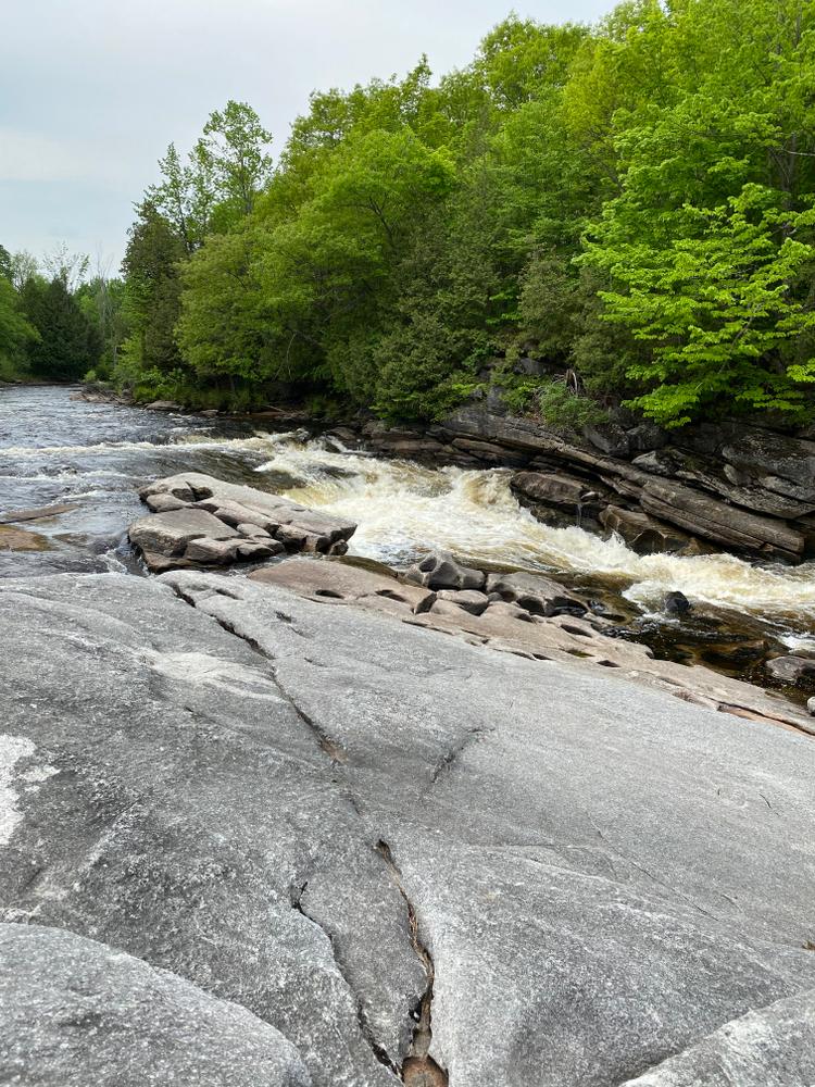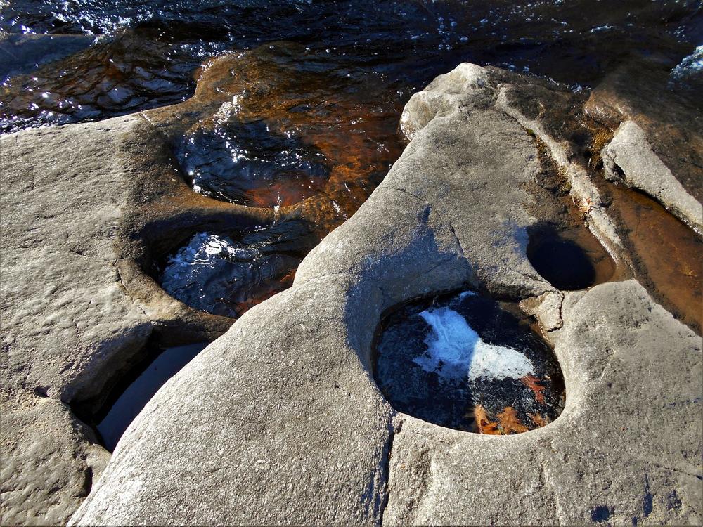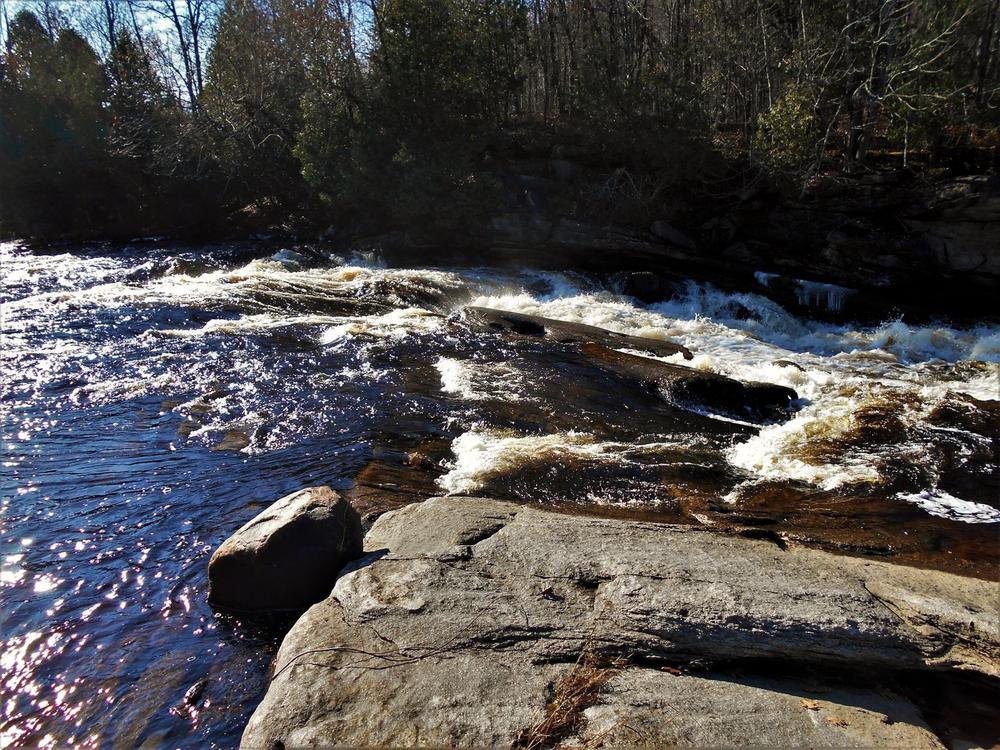 The falls were named after a Mr. Hart that built the mill here after his time as a soldier in the Civil War. Looking downstream you can see the where a raceway was blasted into the bedrock to supply water to the mill. For more on the history of the local area check out Hiking the Trail to Yesterday.