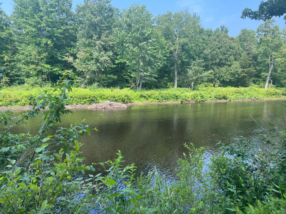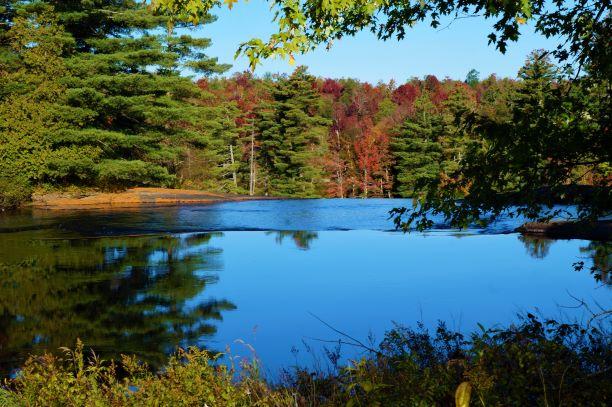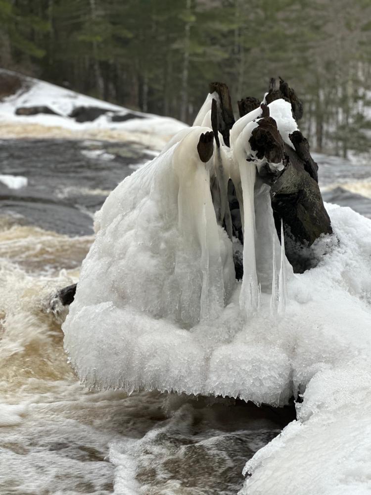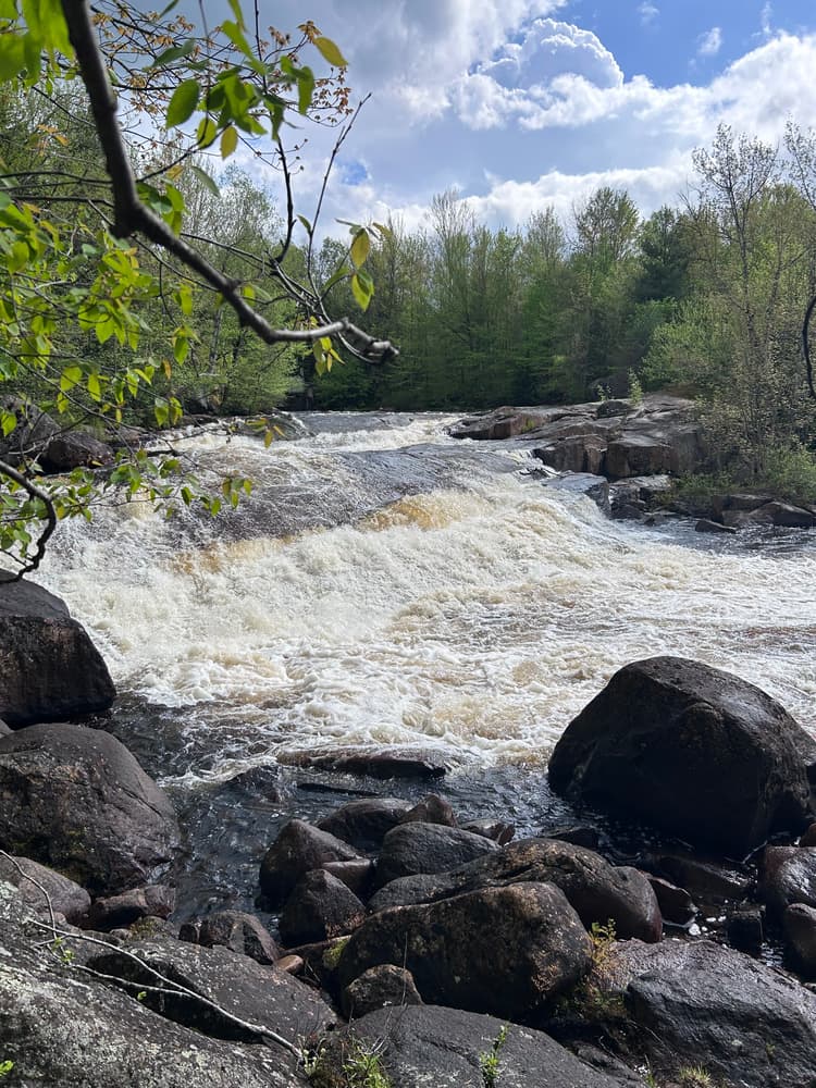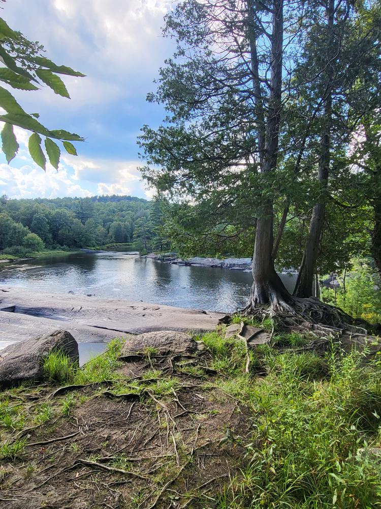 To extend the hike into a longer loop-hike, look for yellow trail markers on the trees that will lead you further downstream along the banks of the river. This section can be overgrown in the summer, but offers scenic views of the Grasse River. After about one mile of walking along the river, near the remnants of an old bridge, the trail turns right and continues gradually uphill on the old Lampson Falls Logging Road. After another mile the old logging road returns to the Lampson Falls Trail just above the falls.