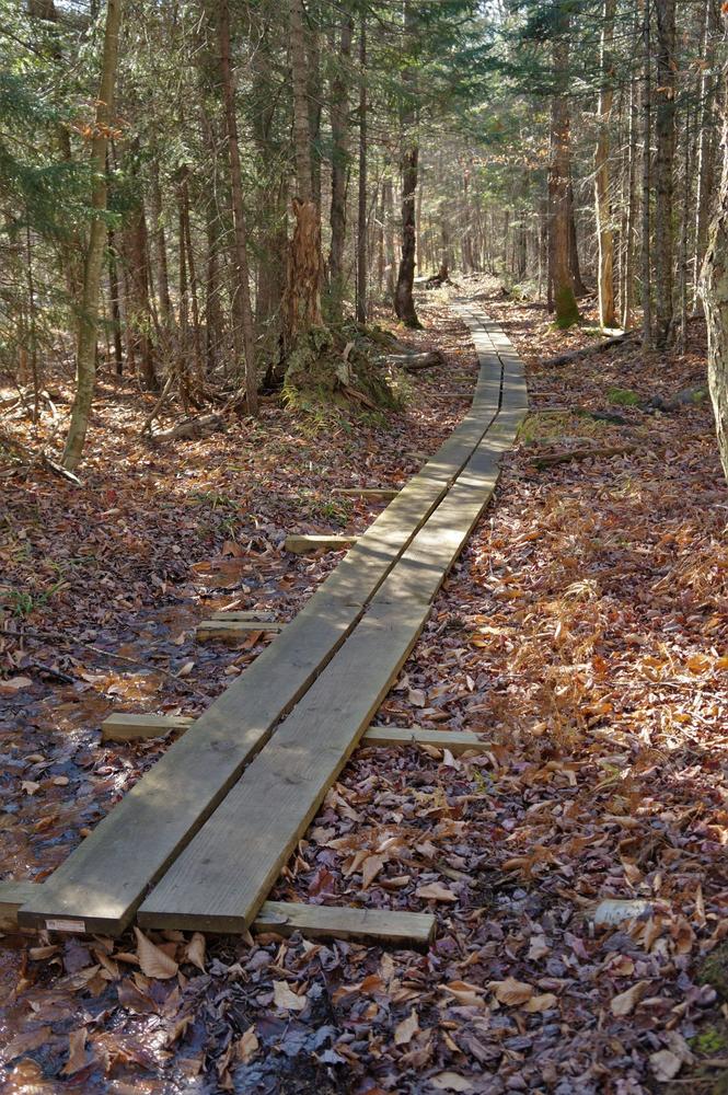 The last 10th of a mile tends to be fairly wet and muddy. There is a stretch of private property just before you reach the Inlet road (2 miles from the start). There is a private camp on your right, and the footbridge to Knollwood is on your left. These are privately owned, so please be respectful. A few hundred yards down the road to your left, brings you to the inlet canoe launch, with an informative kiosk, trail register, and picnic tables. This is where the hotels once stood. There is also an outhouse to the right.