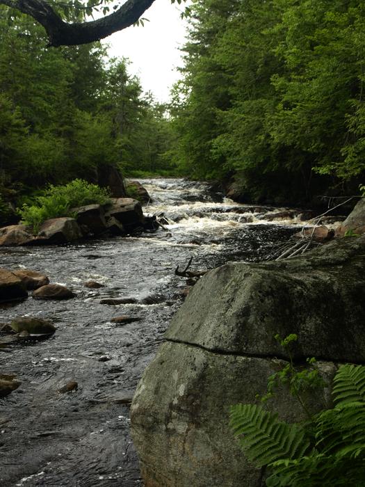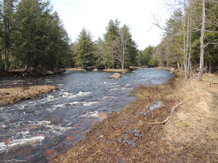 From the parking area, the trail goes over the bank to the river’s edge and continues in a Southwesterly direction. The Oswegatchie is quite shallow here, and very rocky. Several small islands split the river through this stretch. The forest is young here, comprised of yellow birch and beech trees, and a few hemlocks. As you work upstream the trees get larger and white pine, spruce and cedar are the predominant trees.