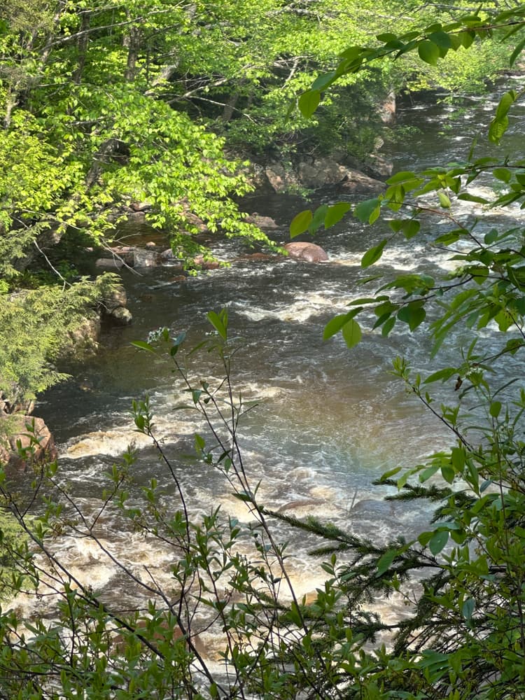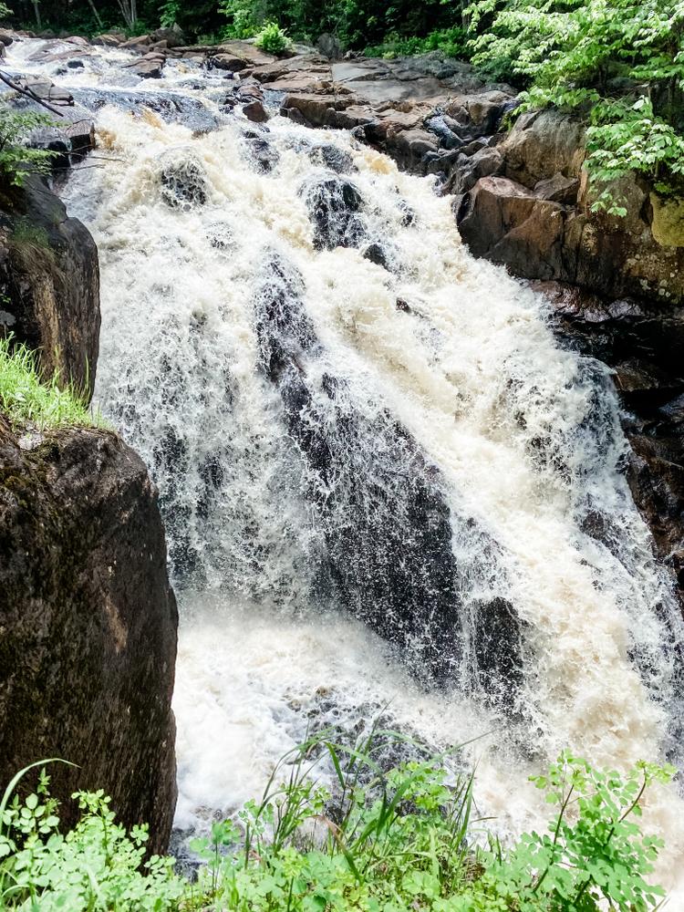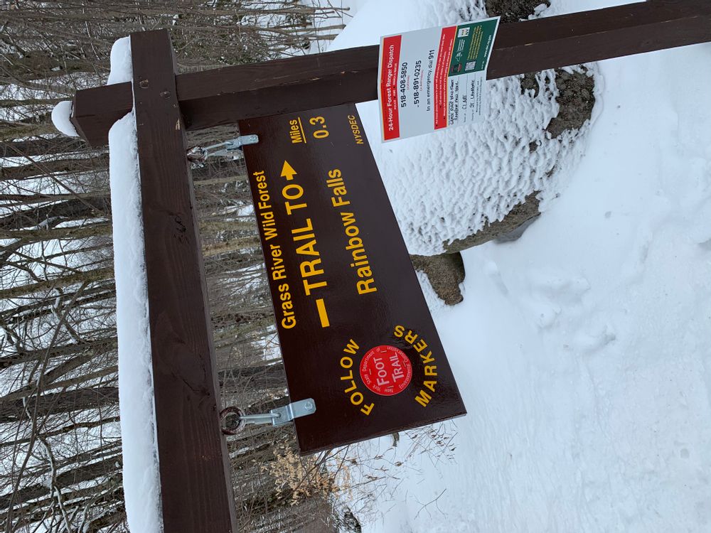 The Rainbow Falls Trail begins as a wide former tote road, closed to vehicle traffic by the row of boulders place near its junction with Tooley Pond Road. Within a few hundred feet, the trail passes into denser forest and narrows to a footpath. After only 0.2 miles, the trail reaches a narrow side channel of the Grass River that forms a small island in the river near the falls. The trail crosses onto the island via a narrow wooden footbridge over the deep crevice of the side channel. Hikers should exercise caution here. Once onto the island, the trail continues for 100 feet and then ends at the far side where the Grass River thunders over the gorgeous 25-foot drop of Rainbow Falls.