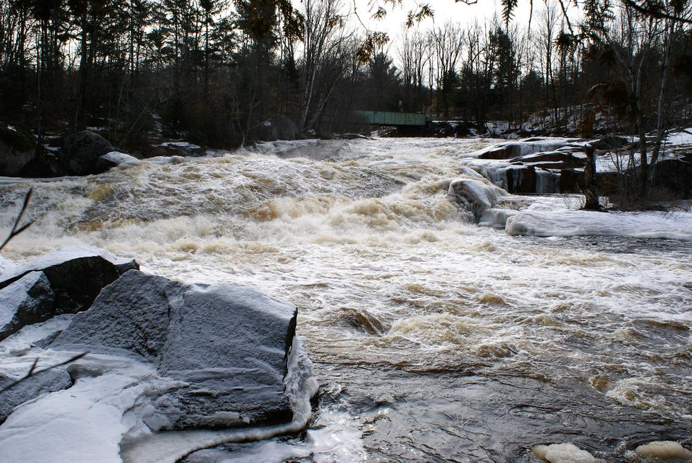 The trail to Sinclair Falls travels less than 0.1 miles down a steep bank from the top of the abutment for the vehicle bridge to the level of the Grass River. The falls are located within sight of the road and trailhead.